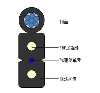 自承式接入網用蝶形引入室內光纜是將光通信單元處于中心,兩側放置兩根平行非金屬加強元件(FRP),在外側再附加一根鋼絲加強元件,最后,擠制黑色或彩色低煙無鹵護套成纜。